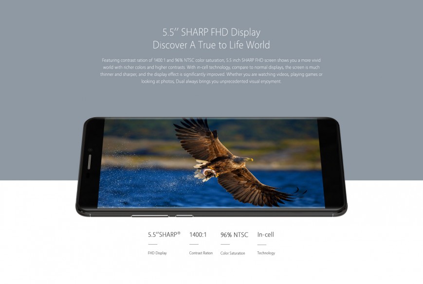 Внутри находится простой и надежный 4-ядерный MediaTek MTK6737T, работающий на частоте 1,5 ГГц. Изогнутого дисплея, о котором также писали инсайдеры, также найти не удастся. У Dual совершенно обычный 5,5-дюймовый экран от Sharp с эффектом 2.5D и с разрешением Full HD.